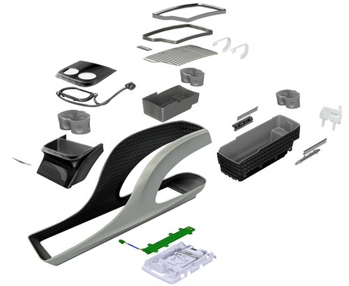 Exploded views were meticulously generated for all interior components of the vehicle, mirroring the detailed approach employed for the instrument panel. Seats, side panels, head liners and in this case, the Center Console. In the development of the Pacifica, various trim levels were available for customer configuration, each necessitating its own set of exploded views. During the initial phase, existing data from the Town and Country was leveraged alongside Photoshop sketching and renderings to facilitate the development of the Bill of Materials (BOM) and costing.
